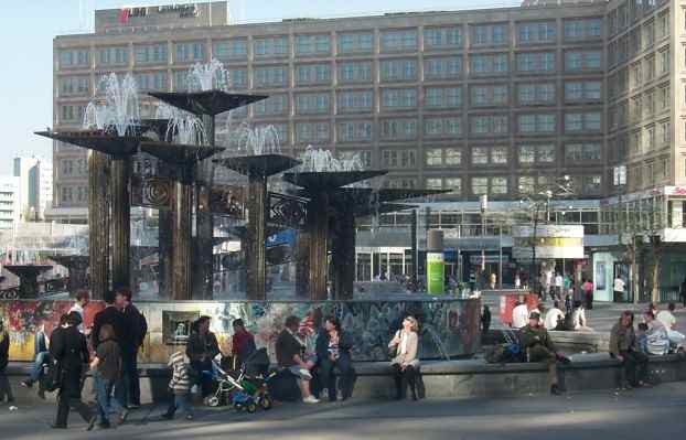 Treffpunkt auf dem Alexanderplatz. In einem zweistufigen, 23 m Durchmesser runden Brunnenbecken sind 17, bis zu 6,30 m hohe rhombenförmige, mit Wasserkronen ausgestattete Schalen spiralförmig angeordnet. Er wurde 1970 nach einem Entwurf von Walter Womacka (* 1925; † 2010) erbaut. |