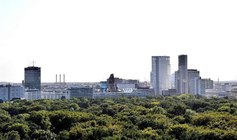 zum "Center am Potsdamer Platz" (ehem. Sony Center) und Teufelsberg (Trümmerberg) sowie Funkturm (Langer Lulatsch), sowie zur Philharmonie, rechts die Straße des 17. Juni, der Kaiserdamm und die Heerstraße, |
