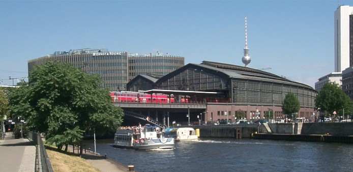 S- und Fernbahnhof Friedrichstraße, vor dem Mauerfall der einzige "Ein- und Auseise S-Bahnhof" nach Ost-Berlin in die DDR. Rechtes Ufer der Spree - das Reichstagufer, links - der Schiffbauer Damm. Von dieser Sicht aus, hinter dem Bahnhof, steht noch immer das ehemalige DDR- Zollkontrollgebäude, in dem viele "Besucher aus dem Westen" |