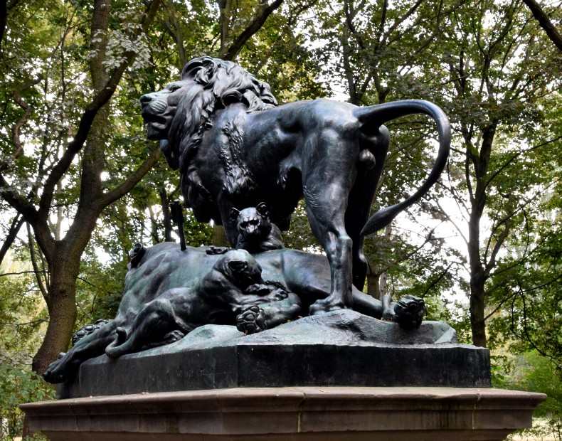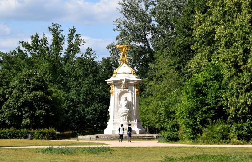 Das Original aus Carrara-Marmor wurde 1880 eingeweiht - 1982 zum Schutz vor schädlichen Witterungseinflüssen in das Lapidarium verbracht. Es ist eine Arbeit des Bildhauers Fritz Schaper (* 1841; † 1919) - wurde restauriert und steht seit 2010 wieder an seinem Ursprungsort am Großen Tiergarten. Das Standbild des Dichters, mit abgestuften Unterbau, hat eine Höhe von insgesamt sechs Meter. Auf ihm sind drei symbolische Figurengruppen angeordnet: Für die lyrische Dichtkunst eine Muse mit Leier für die dramatische Dichtkunst eine sitzende Frauengestalt und der Figur des Eros (mittig), mit Schreibwerkzeug, neben ihr ein Genius mit der abwärts gewandten Fackel des Todes (rechts), für die Forschung eine lesende weibliche Gestalt (links). |