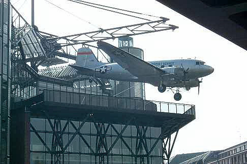 Herzlichen Dank an Herrn Brauner aus Köln, für folgende Informationen: An der Fassade des Neubaus, über einer Terrasse, hängt der Rosinenbomber "Skytrain". Die Douglas DC-3 (keine DC-6) der US-Luftwaffe flog 1948 Lebensmittel in das blockierte Berlin. Sie ist eine Dauerleihgabe des US-Luftwaffenmuseums in Dayton, Ohio. |